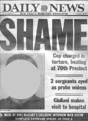 Just to give you a little background to the following picture, I should explain what allegedly happened in a New York City Precint some months ago (How outdated is this?). Suppose the following, none of which has yet been proven in a court of law (read: i don't wanna get sued!): Some guy, let us call him Mr. Simmons, apparently pissed off a particular police officer, and in retaliation, this officer supposedly made Mr. Simmons a victim of horrible torture. It was alleged that the cop forced Mr. Simmons to pull down his pants and shoved the stick-end of a plunger up Mr. Simmons's anus. A few days after the incident, I picked up a New York newspaper and saw the following (of course, the picture is blotched out so I can continue to be able to afford shiny new clothes from Structure and a new hat every four months):