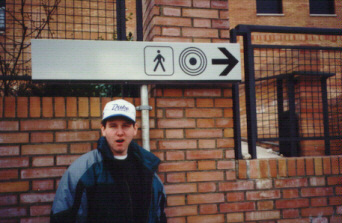 This sign perplexed me greatly. Can you find me in the picture? I'm that big moron imitating that weird sign. At first I thought it was directions to those wanting to play hide-and-go-seek. But then somebody told me that the World Cup Shotput Finals took place just outside our hotel, and that cleared everything up. At the time I took this picture, I believe I thought it meant that the Ice Capades were in town. Don't I feel foolish? | ![]() |