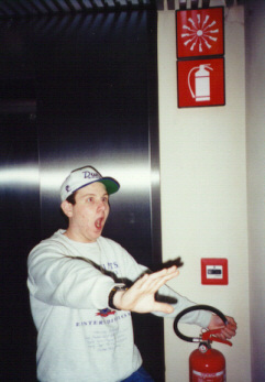| This one was quite puzzling. I think that this sign was there to tell me that I was standing on a large pile of manure. Of course, we didn't rule out that this might be the pole vaulting area. Either way, that stuff at the bottom of the stick is definitely manure.Why do you think that Italy never does well in that event at the Olympics? There's no human excrement to dig that stick into! | The fire hoses in Italy are apparently very tightly coiled, but why they need a sign saying that is beyond my comprehension. In this picture, the moron in the center has seemingly fallen under the hypnotic spell of this sign. Hopefully, none of you will realize that the zombie-like moron is me. Take me to your leader! |