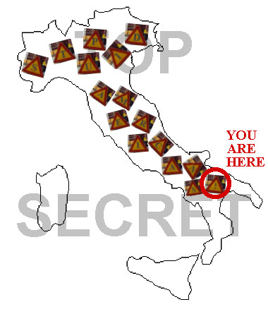 | It was a mystery that we just had to solve. So, later in the day, I asked a member of the Carabinieri, Italy's military police, if I could take a picture with him. Do you see that dorky smile on my face? That's because right before we took the picture, I reached into his pocket (it's not what you're thinking! you have such dirty minds!) and stole this map.... | ![]() |