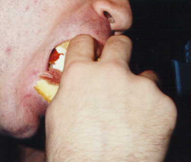 First, Mark Gasparini's love of a good prosciutto, salami and mozarella sandwich was the catalyst to his irrational actions. Although no one actually saw him take this foodstuff out of the garbage, my secret bowtie camera took this shot of him stuffing it into some orifice of his body. One can only hope that it was his mouth. |