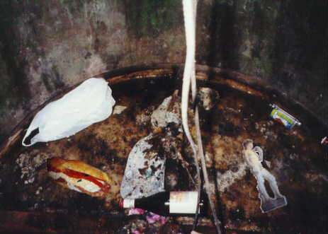 | This is a photograph I took by placing my camera into a giant, spherical garbage can. At first you may notice just normal trash, but if you look closer, it appears that someone threw out a small replica statue of David. Also, it looks as if someone got rid of a perfectly good sandwich. Eventually, we took an even closer look... | ![]() |