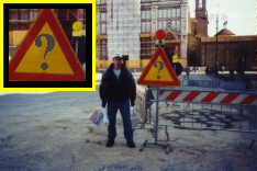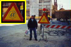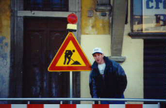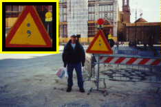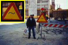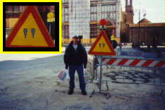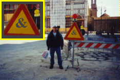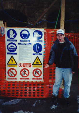 | Here I am at some sort of Italian construction site. I believe that the signs in blue serve as a warning as to what might happen if one of the workers screws up on the job. The worker on the right--let us call him Mr. Hoffa--was later dismembered, his body parts shipped to Giants Stadium for quite an improper burial. As you can see, Mr. Hoffa is wearing a chastity belt, a tradition kept alive since Midieval times. According to the the signs underneath, other things to look out for are bolts of lightning (especially dangerous for those with chastity belts!) and flying wrecking balls. The bottom three signs apparently indicate that one is not allowed to stand on, pull on, or get hit by a crane on the Eiffel Tower. | ![]() |